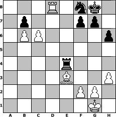 game notation in PGN-format [Event "Trauerspiel :-)"] [Site "www.myChess.de"] [Date "2008.09.20"] [Round "1"] [White "Naunhofer"] [Black "neve"] [ECO "?"] [WhitemyELO "1637"] [BlackmyELO "1510"] [Result "1-0"] [TimeControl "10/864000"] [WhiteDays "09"] [BlackDays "10"] [MyChessNo "48141"] 1. d4 Nf6 2. c4 e6 3. Nc3 d5 4. Nf3 c6 5. e3 Nbd7 6. Be2 Bd6 7. O-O O-O 8. Qc2 e5 9. dxe5 Nxe5 10. Nxe5 Bxe5 11. Rd1 d4 12. exd4 Bxd4 13. Be3 c5 14. Nb5 Qb6 15. Nxd4 cxd4 16. Bxd4 Qe6 17. Bf3 Rd8 18. b3 Qa6 19. b4 Qe6 20. a3 Rb8 21. Bxa7 Rxd1+ 22. Rxd1 Ra8 23. Bg4 Qc6 24. b5 Qe8 25. Bxc8 Qxc8 26. Bb6 Nd7 27. Be3 Rxa3 28. Qd2 Nf8 29. c5 h6 30. Qb4 Qa8 31. h3 Qa5 32. Qb1 Qa4 33. b6 Rb3 34. Qc2 Rb4 35. Qxa4 Rxa4 36. Rd8 Re4 37. c6 1-0 position notation in FEN-format 3R1nk1/1p3pp1/1PP4p/8/4r3/4B2P/5PP1/6K1 - - - 0 37 Captured white pieces: Captured black pieces: Click on a captured piece in order to display the desired move!