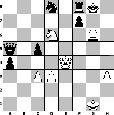 game notation in PGN-format [Event "5erd2"] [Site "www.myChess.de"] [Date "2017.01.17"] [Round "1"] [White "espero"] [Black "deepsabel"] [ECO "A07"] [WhitemyELO "1854"] [BlackmyELO "1949"] [Result "1/2-1/2"] [TimeControl "10/2592000"] [WhiteDays "70"] [BlackDays "93"] [MyChessNo "106513"] 1. Nf3 d5 2. g3 c6 3. Bg2 Nf6 4. O-O Bg4 5. h3 Bh5 6. d3 Nbd7 7. g4 Bg6 8. Bf4 e6 9. Nbd2 Be7 10. Nh4 O-O 11. Nxg6 hxg6 12. Bg3 Re8 13. f4 Qb6+ 14. Kh1 Qxb2 15. Rb1 Qxa2 16. Rxb7 Rab8 17. Rxb8 Nxb8 18. Qb1 Qa5 19. Nb3 Qb6 20. Qa2 c5 21. c3 Nc6 22. Nd2 a5 23. f5 gxf5 24. gxf5 exf5 25. Bxd5 Nxd5 26. Qxd5 g6 27. Rb1 Qa6 28. Nc4 Bd8 29. Kg1 a4 30. e4 fxe4 31. Rf1 Rf8 32. Bd6 Be7 33. Qxe4 Bxd6 34. Nxd6 Nd8 35. Rf6 Qa5 36. Rxg6+ 1/2-1/2 position notation in FEN-format 3n1rk1/5p2/3N2R1/q1p5/p3Q3/2PP3P/8/6K1 - - - 0 36 Captured white pieces: Captured black pieces: Click on a captured piece in order to display the desired move!