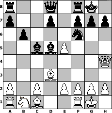 game notation in PGN-format [Event "#2"] [Site "www.myChess.de"] [Date "2015.01.20"] [Round "1"] [White "iamnothere"] [Black "Knight"] [ECO "C45"] [WhitemyELO "1500"] [BlackmyELO "1316"] [Result "1-0"] [TimeControl "10/1728000"] [WhiteDays "39"] [BlackDays "40"] [MyChessNo "97774"] 1. e4 e5 2. Nf3 Nc6 3. d4 exd4 4. Nxd4 Nxd4 5. Qxd4 Nf6 6. Bd3 b6 7. O-O Bb7 8. b4 c5 9. bxc5 Bxc5 10. Qc4 O-O 11. e5 Bd5 12. Qh4 1-0 position notation in FEN-format r2q1rk1/p2p1ppp/1p3n2/2bbP3/7Q/3B4/P1P1PPPP/RNB2RK1 - - - 2 12 Captured white pieces: Captured black pieces: Click on a captured piece in order to display the desired move!