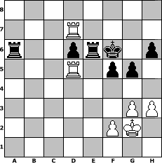 game notation in PGN-format [Event "Gegen die Sommerflaute"] [Site "www.myChess.de"] [Date "2013.07.17"] [Round "1"] [White "Steffi"] [Black "Joschi"] [ECO "A57"] [WhitemyELO "1514"] [BlackmyELO "1527"] [Result "1/2-1/2"] [TimeControl "10/864000"] [WhiteDays "29"] [BlackDays "50"] [MyChessNo "89342"] 1. d4 Nf6 2. c4 c5 3. d5 b5 4. cxb5 a6 5. e3 axb5 6. d6 exd6 7. Bxb5 Nc6 8. Nc3 Be7 9. Nf3 O-O 10. O-O Ba6 11. Bxa6 Rxa6 12. Qe2 Qb6 13. h3 Rfa8 14. a3 Na5 15. Qd3 Nb3 16. Rb1 Nxc1 17. Rfxc1 Qc6 18. Ne2 Qd5 19. Qxd5 Nxd5 20. e4 Nb6 21. Nc3 Na4 22. Nd5 Bd8 23. Nd2 Nb6 24. b4 Nxd5 25. exd5 Bg5 26. Rd1 Bxd2 27. Rxd2 Rxa3 28. Rc2 Rd3 29. bxc5 Rxd5 30. cxd6 Rxd6 31. Rbc1 g6 32. Rc7 Raa6 33. Re1 Rac6 34. Rb7 Re6 35. Rd1 d6 36. Rb8+ Kg7 37. Rd8 Kf6 38. Rd7 h6 39. Kf1 g5 40. g3 Kg6 41. Kg2 f5 42. Rd4 Kf6 43. Rd5 Ra6 44. Rh7 Kg6 45. Rd7 Rf6 46. Rd4 Re6 47. Rd2 Kf6 48. Rd5 1/2-1/2 position notation in FEN-format 8/3R4/r2prk1p/3R1pp1/8/6PP/5PK1/8 - - - 13 48 Captured white pieces: Captured black pieces: Click on a captured piece in order to display the desired move!