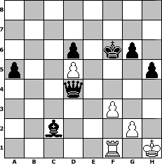 game notation in PGN-format [Event "Love, Peace and Harmony 1"] [Site "www.myChess.de"] [Date "2010.05.08"] [Round "1"] [White "Master1"] [Black "Gauss1233"] [ECO "E90"] [WhitemyELO "1333"] [BlackmyELO "1448"] [Result "0-1"] [TimeControl "10/864000"] [WhiteDays "28"] [BlackDays "49"] [MyChessNo "65436"] 1. d4 Nf6 2. c4 g6 3. Nc3 Bg7 4. e4 d6 5. Nf3 b6 6. Bd3 Bb7 7. Bg5 O-O 8. O-O c6 9. Re1 Nbd7 10. h3 h6 11. Bxf6 Bxf6 12. Ne2 e5 13. d5 Nc5 14. b3 Nxd3 15. Qxd3 cxd5 16. cxd5 a5 17. a4 Be7 18. Nc3 Ba6 19. Qe3 Kg7 20. Ne2 Qc7 21. Ng3 Rac8 22. Rac1 Qb7 23. Rxc8 Rxc8 24. h4 b5 25. axb5 Bxb5 26. h5 Ba6 27. hxg6 fxg6 28. Nh2 Bg5 29. Qf3 Rf8 30. Qc3 Qb6 31. Nf3 Rc8 32. Qb2 Bc4 33. Rb1 Bd3 34. Rd1 Rc2 35. Qd4 exd4 36. Nxg5 Qxb3 37. Ne6+ Kf6 38. Nxd4 Qc4 39. Nxc2 Qxc2 40. Re1 h5 41. Nf1 Bxe4 42. Ne3 Qd2 43. Rd1 Qc3 44. f3 Qxe3+ 45. Kh1 Bc2 46. Rf1 Qd4 0-1 position notation in FEN-format 8/8/3p1kp1/p2P3p/3q4/5P2/2b3P1/5R1K - - - 4 47 Captured white pieces: Captured black pieces: Click on a captured piece in order to display the desired move!