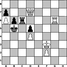 | game notation in PGN-format [Event "Wrixum Open die II."] [Site "www.myChess.de"] [Date "2005.06.22"] [Round "1"] [White "chessmike"] [Black "bane"] [ECO "D24"] [WhitemyELO "1919"] [BlackmyELO "1875"] [Result "1-0"] [TimeControl "10/1728000"] [WhiteDays "100"] [BlackDays "100"] [MyChessNo "14403"] 1. d4 d5 2. c4 dxc4 3. Nf3 Nf6 4. Nc3 c6 5. a4 e6 6. e3 Bb4 7. Bxc4 Qa5 8. Qc2 O-O 9. O-O Rd8 10. e4 Nbd7 11. e5 Nd5 12. Nxd5 cxd5 13. Ng5 f5 14. exf6 Nxf6 15. Bd3 h6 16. Bh7+ Kf8 17. Nf3 Bd7 18. Ne5 Rac8 19. Qd3 Be8 20. Qf3 Be7 21. Be3 Qb4 22. a5 Bh5 23. g4 Bf7 24. h4 Bd6 25. Nxf7 Kxf7 26. g5 hxg5 27. hxg5 Rh8 28. Bd3 Bh2+ 29. Kg2 Rcg8 30. Rh1 Qd6 31. Kf1 Qb4 32. a6 b6 33. Rc1 Qb3 34. Bd2 Ke7 35. gxf6+ gxf6 36. Ke2 Bb8 37. Rxh8 Rxh8 38. Rg1 Rf8 39. Rg7+ Kd6 40. Bf4+ Kc6 41. Bxb8 Rxb8 42. Qxf6 Qxb2+ 43. Kf3 Qa3 44. Qxe6+ Qd6 45. Bb5+ Kxb5 46. Qxd6 Rc8 47. Qd7+ Rc6 48. Rg6 1-0 position notation in FEN-format 8/p2Q4/Ppr3R1/1k1p4/3P4/5K2/5P2/8 - - - 4 48 Captured white pieces:                              Captured black pieces:                               Click on a captured piece in order to display the desired move!