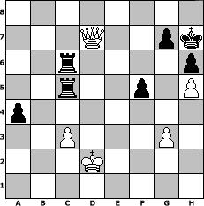 game notation in PGN-format [Event "Bremer Schl"] [Site "www.myChess.de"] [Date "2010.04.10"] [Round "1"] [White "PeterLoskarn"] [Black "dbuse"] [ECO "C36"] [WhitemyELO "2188"] [BlackmyELO "2104"] [Result "0-1"] [TimeControl "10/3456000"] [WhiteDays "151"] [BlackDays "142"] [MyChessNo "64733"] 1. e4 e5 2. f4 exf4 3. Nf3 d5 4. exd5 Nf6 5. c4 c6 6. d4 Bb4+ 7. Nc3 cxd5 8. Bxf4 O-O 9. Be2 dxc4 10. O-O Bxc3 11. bxc3 Be6 12. Ne5 Qc8 13. Qe1 Nbd7 14. Bf3 Nd5 15. Qg3 Nxf4 16. Qxf4 Nb6 17. Be4 Nd5 18. Qf3 Qd8 19. a4 Rc8 20. Rae1 Rc7 21. Qg3 Qd6 22. Qh4 f5 23. Bxd5 Bxd5 24. Re3 Be4 25. Rh3 h6 26. Re3 a6 27. a5 Qd5 28. Rg3 Kh7 29. Qh5 Rf6 30. Rg6 Rcf7 31. Ra1 Qxe5 32. dxe5 Rxg6 33. g3 Re7 34. Re1 Rg5 35. Qe2 Rxe5 36. Kf2 Rd5 37. Qa2 Rg6 38. Re2 Rc6 39. Qa3 Rcc5 40. Qb4 Rb5 41. Qe7 Bd3 42. Rd2 Rb1 43. Qc7 Rdb5 44. h4 Rh1 45. Ke3 Rb3 46. Rxd3 cxd3 47. Qf7 Rb5 48. Kxd3 Rd1+ 49. Kc2 Rd6 50. h5 Rc6 51. Kd2 Rxa5 52. Qxb7 Rac5 53. Qf7 a5 54. Qd7 a4 0-1 position notation in FEN-format 8/3Q2pk/2r4p/2r2p1P/p7/2P3P1/3K4/8 - - - 0 55 Captured white pieces: Captured black pieces: Click on a captured piece in order to display the desired move!
