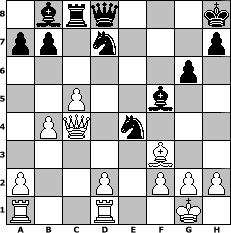 game notation in PGN-format [Event "Schneeturnier"] [Site "www.myChess.de"] [Date "2010.02.08"] [Round "1"] [White "deepsabel"] [Black "HPB2005"] [ECO "E92"] [WhitemyELO "1990"] [BlackmyELO "1948"] [Result "1/2-1/2"] [TimeControl "10/2592000"] [WhiteDays "69"] [BlackDays "51"] [MyChessNo "63098"] 1. d4 Nf6 2. c4 g6 3. Nc3 Bg7 4. e4 d6 5. Nf3 O-O 6. Be2 e5 7. Be3 Nbd7 8. O-O c6 9. d5 c5 10. Ne1 Ne8 11. Nd3 Nb6 12. Qb3 f5 13. exf5 Bxf5 14. Nxc5 dxc5 15. Bxc5 Nf6 16. Bxf8 Bxf8 17. d6 Nbd7 18. c5+ Kh8 19. Qc4 Rc8 20. b4 Bxd6 21. Rfd1 Bb8 22. Bf3 e4 23. Nxe4 Nxe4 1/2-1/2 position notation in FEN-format 1brq3k/pp1n3p/6p1/2P2b2/1PQ1n3/5B2/P2P1PPP/R2R2K1 - - - 0 24 Captured white pieces: Captured black pieces: Click on a captured piece in order to display the desired move!