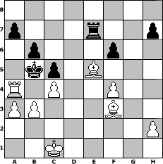 game notation in PGN-format [Event "Bauer56-Turnier-1"] [Site "www.myChess.de"] [Date "2012.02.17"] [Round "1"] [White "martinus"] [Black "Bauer56"] [ECO "C21"] [WhitemyELO "1752"] [BlackmyELO "1497"] [Result "1-0"] [TimeControl "10/1728000"] [WhiteDays "20"] [BlackDays "20"] [MyChessNo "79957"] 1. e4 e5 2. d4 d5 3. dxe5 Nc6 4. exd5 Nxe5 5. Qe2 Qxd5 6. f4 Qa5+ 7. Bd2 Qa6 8. Qxe5+ Qe6 9. Qxe6+ Bxe6 10. Nc3 O-O-O 11. O-O-O Nf6 12. Nf3 Bg4 13. Be2 Bb4 14. a3 Bxc3 15. Bxc3 Rde8 16. Rhe1 Ne4 17. Bxg7 Rhg8 18. Bd4 Bxf3 19. Bxf3 Nd6 20. Be5 Nc4 21. Bd5 Re7 22. Bxc4 Rxg2 23. Re2 Rxe2 24. Bxe2 b6 25. Bg4+ Kb8 26. Rd8+ Kb7 27. Bf3+ Ka6 28. Rd4 c5 29. Ra4+ Kb5 30. b3 f6 31. c4# 1-0 position notation in FEN-format 8/p3r2p/1p3p2/1kp1B3/R1P2P2/PP3B2/7P/2K5 - - - 0 31 Captured white pieces: Captured black pieces: Click on a captured piece in order to display the desired move!