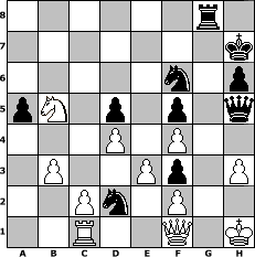 game notation in PGN-format [Event "Trotz Sturm und Regen die Figuren bewegen"] [Site "www.myChess.de"] [Date "2020.03.16"] [Round "1"] [White "spiderman"] [Black "Ziegert"] [ECO "A00"] [WhitemyELO "1824"] [BlackmyELO "1947"] [Result "0-1"] [TimeControl "10/2592000"] [WhiteDays "26"] [BlackDays "27"] [MyChessNo "117555"] 1. g3 f5 2. Nf3 Nf6 3. Nc3 g6 4. d4 Bg7 5. Bg2 O-O 6. O-O d6 7. Be3 c6 8. Qd2 Nbd7 9. Bh6 e5 10. Bxg7 Kxg7 11. e3 e4 12. Ng5 Nb6 13. a4 h6 14. Nh3 g5 15. Rfe1 Nc4 16. Qe2 d5 17. b3 Nd6 18. Kh1 a5 19. Rac1 Be6 20. Nb1 Qd7 21. Qf1 b5 22. Nf4 gxf4 23. gxf4 Bf7 24. axb5 cxb5 25. Qe2 Bh5 26. Qd2 Rg8 27. Rg1 Kh7 28. Na3 Bf3 29. Bxf3 exf3 30. h3 Qf7 31. Rxg8 Rxg8 32. Qd1 Qh5 33. Qf1 Nde4 34. Nxb5 Nd2 0-1 position notation in FEN-format 6r1/7k/5n1p/pN1p1p1q/3P1P2/1P2Pp1P/2Pn1P2/2R2Q1K - - - 1 35 Captured white pieces: Captured black pieces: Click on a captured piece in order to display the desired move!