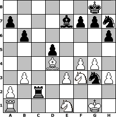 game notation in PGN-format [Event "M"] [Site "www.myChess.de"] [Date "2013.09.19"] [Round "1"] [White "sprinterde"] [Black "Steffi"] [ECO "A13"] [WhitemyELO "1713"] [BlackmyELO "1547"] [Result "1/2-1/2"] [TimeControl "10/3456000"] [WhiteDays "40"] [BlackDays "40"] [MyChessNo "90345"] 1. c4 e6 2. Nc3 d5 3. e3 Nf6 4. Qb3 c6 5. Nf3 Be7 6. cxd5 exd5 7. Bd3 O-O 8. Qc2 h6 9. O-O Nbd7 10. b3 Nc5 11. Be2 Re8 12. d4 Nce4 13. Nd1 Bg4 14. h3 Bh5 15. g4 Bg6 16. Bd3 Qc8 17. Ne5 Bh7 18. f3 Ng5 19. Bxh7+ Ngxh7 20. f4 c5 21. Bb2 cxd4 22. Qxc8 Raxc8 23. Bxd4 b6 24. Nf2 Ne4 25. Nfd3 Rc2 26. Rfc1 Rec8 27. Rxc2 Rxc2 28. Nf3 Ng3 29. Nde1 Ne2+ 30. Kf1 Ng3+ 31. Kg1 Ne2+ 32. Kf1 Ng3+ 33. Kg1 1/2-1/2 position notation in FEN-format 6k1/p3bppn/1p5p/3p4/3B1PP1/1P2PNnP/P1r5/R3N1K1 - - - 11 33 Captured white pieces: Captured black pieces: Click on a captured piece in order to display the desired move!