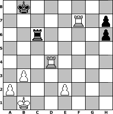 game notation in PGN-format [Event "Albspiele 29"] [Site "www.myChess.de"] [Date "2013.03.30"] [Round "1"] [White "Knight"] [Black "Master1"] [ECO "C20"] [WhitemyELO "1219"] [BlackmyELO "1235"] [Result "1-0"] [TimeControl "10/1728000"] [WhiteDays "20"] [BlackDays "20"] [MyChessNo "87581"] 1. e4 e5 2. Qh5 Nc6 3. Bc4 Qf6 4. Nf3 Be7 5. Nc3 d6 6. Nd5 Qh6 7. Qxh6 Nxh6 8. Nxc7+ Kd7 9. Nxa8 f6 10. d3 Na5 11. Bxh6 gxh6 12. Bb5+ Kd8 13. O-O-O Bd7 14. Bxd7 Kxd7 15. Nb6+ axb6 16. d4 Rg8 17. dxe5 fxe5 18. Nxe5+ Ke6 19. Nd3 Kd7 20. e5 Rxg2 21. exd6 Bxd6 22. Nf4 Rxf2 23. Nd5 Kc6 24. Rhe1 Rxh2 25. Ne7+ Bxe7 26. Rxe7 Nc4 27. b3 Na3 28. Re6+ Kc7 29. Rd2 Rh1+ 30. Kb2 Nb5 31. Rf2 Nd4 32. Rf7+ Kb8 33. Rxb6 Rh2 34. Rbxb7+ Kc8 35. Ra7 Rxc2+ 36. Kb1 Kb8 37. Rad7 Rc6 38. Rxd4 1-0 position notation in FEN-format 1k6/5R1p/2r4p/8/3R4/1P6/P3P3/1K6 - - - 0 38 Captured white pieces: Captured black pieces: Click on a captured piece in order to display the desired move!
