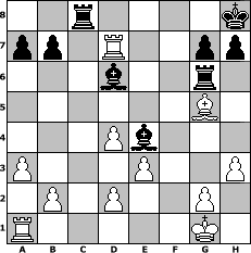 | game notation in PGN-format [Event "Zug um Zug gegen Fr"] [Site "www.myChess.de"] [Date "2010.05.04"] [Round "1"] [White "Seneca"] [Black "leitsgeheier"] [ECO "D00"] [WhitemyELO "1546"] [BlackmyELO "1577"] [Result "0-1"] [TimeControl "10/2592000"] [WhiteDays "82"] [BlackDays "83"] [MyChessNo "65326"] 1. d4 d5 2. Bf4 Nf6 3. h3 c5 4. dxc5 e6 5. e3 Bxc5 6. Nf3 Nc6 7. c3 O-O 8. Bd3 Re8 9. O-O e5 10. Bg5 e4 11. Bxe4 dxe4 12. Nd4 Nxd4 13. cxd4 Be7 14. Nc3 Bf5 15. a3 Rc8 16. Qb3 Qd7 17. f3 exf3 18. Rxf3 Ne4 19. Nxe4 Bxe4 20. Qxf7+ Kh8 21. Rg3 Bg6 22. Qb3 Bd6 23. Rf3 Be4 24. Rf7 Qe6 25. Qxe6 Rxe6 26. Rd7 Rg6 0-1 position notation in FEN-format 2r4k/pp1R2pp/3b2r1/6B1/3Pb3/P3P2P/1P1P2P1/R5K1 - - - 2 27 Captured white pieces:                              Captured black pieces:                               Click on a captured piece in order to display the desired move!