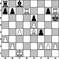 game notation in PGN-format [Event "II. Intergalaktische Meisterschaft"] [Site "www.myChess.de"] [Date "2008.09.08"] [Round "1"] [White "kischok46"] [Black "Haneken"] [ECO "A40"] [WhitemyELO "2015"] [BlackmyELO "1506"] [Result "1-0"] [TimeControl "10/2592000"] [WhiteDays "30"] [BlackDays "30"] [MyChessNo "47853"] 1. d4 e6 2. c4 Bb4+ 3. Bd2 Nc6 4. Bxb4 Nxb4 5. Nc3 Nf6 6. e4 d5 7. a3 Nc6 8. e5 Ne4 9. Bd3 Nxd4 10. Nxe4 dxe4 11. Bxe4 O-O 12. Ne2 c5 13. Nxd4 Qxd4 14. Qxd4 cxd4 15. O-O-O Rd8 16. Rd2 Rd7 17. Rhd1 f5 18. Bf3 d3 19. Rxd3 Re7 20. Rd8+ Kf7 21. Rh8 Kg6 22. Rd4 Rd7 23. Rxd7 f4 24. Be4+ Kh6 25. Rxh7+ 1-0 position notation in FEN-format r1b5/pp1R2pR/4p2k/4P3/2P1Bp2/P7/1P3PPP/2K5 - - - 0 25 Captured white pieces: Captured black pieces: Click on a captured piece in order to display the desired move!