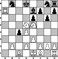 game notation in PGN-format [Event "Sommer ade"] [Site "www.myChess.de"] [Date "2021.09.02"] [Round "1"] [White "hsvler"] [Black "lotchi"] [ECO "D20"] [WhitemyELO "1514"] [BlackmyELO "1305"] [Result "1-0"] [TimeControl "10/2592000"] [WhiteDays "38"] [BlackDays "52"] [MyChessNo "122873"] 1. d4 d5 2. c4 dxc4 3. e3 b5 4. a4 c6 5. axb5 cxb5 6. Qf3 Qc7 7. Qxa8 Qb7 8. Qxb7 Bxb7 9. Rxa7 Bc6 10. Nf3 g6 11. Ne5 Bd5 12. Nc3 e6 13. Nxb5 Be7 14. Nc7+ Kd8 15. Nxd5 1-0 position notation in FEN-format 1n1k2nr/R3bp1p/4p1p1/3NN3/2pP4/4P3/1P1P1PPP/2B1KB1R - K - 0 15 Captured white pieces: Captured black pieces: Click on a captured piece in order to display the desired move!