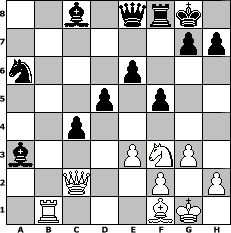 game notation in PGN-format [Event "4. Norderstedter DENK MAL Open 2013"] [Site "www.myChess.de"] [Date "2013.01.09"] [Round "1"] [White "FrankB"] [Black "Teresa"] [ECO "A81"] [WhitemyELO "1518"] [BlackmyELO "1509"] [Result "0-1"] [TimeControl "10/2592000"] [WhiteDays "30"] [BlackDays "30"] [MyChessNo "86066"] 1. d4 f5 2. g3 e6 3. Bg2 Nf6 4. c4 Nc6 5. Nf3 d5 6. Nbd2 Be7 7. O-O O-O 8. e3 a5 9. b3 a4 10. bxa4 Ne4 11. c5 Qe8 12. Ba3 b6 13. Rc1 bxc5 14. Bxc5 Nxc5 15. dxc5 Nb4 16. Nb1 Nxa2 17. Rc2 Nb4 18. Rc3 Rxa4 19. Re1 Ra5 20. Qb3 Na6 21. Rec1 Nxc5 22. Qc2 Na6 23. Bf1 c5 24. Ra3 Rxa3 25. Nxa3 c4 26. Rb1 Bxa3 0-1 position notation in FEN-format 2b1qrk1/6pp/n3p3/3p1p2/2p5/b3PNP1/2Q2P1P/1R3BK1 - - - 0 27 Captured white pieces: Captured black pieces: Click on a captured piece in order to display the desired move!