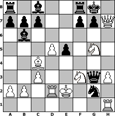 game notation in PGN-format [Event "K"] [Site "www.myChess.de"] [Date "2006.08.04"] [Round "1"] [White "Falcor"] [Black "Hobbykegler"] [ECO "C33"] [WhitemyELO "1414"] [BlackmyELO "1155"] [Result "1-0"] [TimeControl "10/864000"] [WhiteDays "22"] [BlackDays "25"] [MyChessNo "27405"] 1. e4 e5 2. f4 exf4 3. Bc4 Nh6 4. d4 Qh4+ 5. Kf1 Ng4 6. Nh3 Ne3+ 7. Bxe3 fxe3 8. Qf3 Bb4 9. c3 Ba5 10. Qxe3 Nc6 11. Ng5 d6 12. Nd2 O-O 13. Ndf3 Qg4 14. h3 Qg3 15. e5 dxe5 16. d5 Ne7 17. Rd1 Nf5 18. Qe4 Bb6 19. Rd2 Ne3+ 20. Ke2 Nxg2 21. Qxh7# 1-0 position notation in FEN-format r1b2rk1/ppp2ppQ/1b6/3Pp1N1/2B5/2P2NqP/PP1RK1n1/7R - - - 0 21 Captured white pieces: Captured black pieces: Click on a captured piece in order to display the desired move!