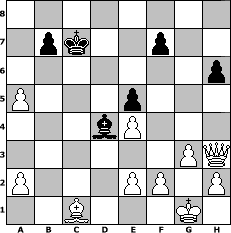 game notation in PGN-format [Event "Friends 2"] [Site "www.myChess.de"] [Date "2007.01.01"] [Round "1"] [White "HenrySchinasky"] [Black "Master1"] [ECO "B22"] [WhitemyELO "1556"] [BlackmyELO "1476"] [Result "1-0"] [TimeControl "10/864000"] [WhiteDays "10"] [BlackDays "10"] [MyChessNo "31266"] 1. e4 c5 2. c3 Qa5 3. Nf3 Nc6 4. d4 cxd4 5. Nxd4 Nxd4 6. Qxd4 e5 7. Qe3 d5 8. b4 Qd8 9. Bd3 d4 10. Qg3 Bd6 11. Qxg7 Qf6 12. Bb5+ Bd7 13. Bxd7+ Kxd7 14. Qg4+ Kc7 15. O-O Nh6 16. Qh3 Rhg8 17. Bxh6 Rg6 18. Bd2 Rag8 19. g3 Rh6 20. Bxh6 Rg6 21. Bd2 h6 22. Na3 a5 23. bxa5 Bxa3 24. cxd4 Bb2 25. Rab1 Bxd4 26. Rfc1+ Qc6 27. Rxc6+ Rxc6 28. Rc1 Rxc1+ 29. Bxc1 1-0 position notation in FEN-format 8/1pk2p2/7p/P3p3/3bP3/6PQ/P3PP1P/2B3K1 - - - 0 29 Captured white pieces: ![]() ![]() ![]() ![]() ![]() ![]() ![]() ![]() ![]() ![]() ![]() ![]() ![]() ![]() ![]() Captured black pieces: ![]() ![]() ![]() ![]() ![]() ![]() ![]() ![]() ![]() ![]() ![]() ![]() ![]() ![]() ![]() Click on a captured piece in order to display the desired move!
