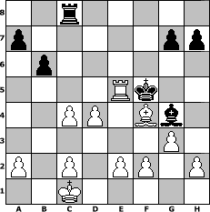 game notation in PGN-format [Event "Kellertunier"] [Site "www.myChess.de"] [Date "2005.08.15"] [Round "2"] [White "MaxPayne"] [Black "Andylein1989"] [ECO "C26"] [WhitemyELO "1406"] [BlackmyELO "1414"] [Result "1-0"] [TimeControl "10/864000"] [WhiteDays "10"] [BlackDays "10"] [MyChessNo "16263"] 1. e4 e5 2. Nc3 Nf6 3. Bc4 Bb4 4. d3 Bxc3+ 5. bxc3 d5 6. exd5 Nxd5 7. Bb2 Nf4 8. Qf3 Qg5 9. g3 Ng6 10. Bxf7+ Kd8 11. Qd5+ Nd7 12. Nf3 Qf6 13. Bxg6 Qxg6 14. Nxe5 Qd6 15. Qxd6 cxd6 16. Nf7+ Ke7 17. Nxh8 Ne5 18. O-O-O Bg4 19. Rde1 Rxh8 20. c4 Kf6 21. Ba3 Bf3 22. Rhg1 Bg4 23. Bxd6 Nf3 24. Bc5 Nxg1 25. Rxg1 b6 26. Bd6 Ke6 27. Bf4 Rf8 28. Re1+ Kf5 29. d4 Rc8 30. Re5+ 1-0 position notation in FEN-format 2r5/p5pp/1p6/4Rk2/2PP1Bb1/6P1/P1P1PP1P/2K5 - - - 2 30 Captured white pieces: ![]() ![]() ![]() ![]() ![]() ![]() ![]() ![]() ![]() ![]() ![]() ![]() ![]() ![]() ![]() Captured black pieces: ![]() ![]() ![]() ![]() ![]() ![]() ![]() ![]() ![]() ![]() ![]() ![]() ![]() ![]() ![]() Click on a captured piece in order to display the desired move!