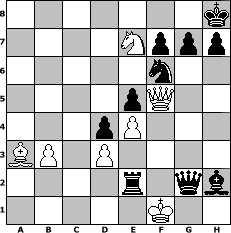 game notation in PGN-format [Event "Freibier f"] [Site "www.myChess.de"] [Date "2006.11.11"] [Round "1"] [White "crca108"] [Black "Seneca"] [ECO "B23"] [WhitemyELO "1374"] [BlackmyELO "1711"] [Result "0-1"] [TimeControl "10/864000"] [WhiteDays "39"] [BlackDays "23"] [MyChessNo "30055"] 1. e4 c5 2. Nc3 e6 3. g3 d5 4. Bb5+ Nc6 5. Qf3 d4 6. Nd5 Bd7 7. Bxc6 Bxc6 8. Nf4 Nf6 9. d3 Bd6 10. Nge2 b5 11. O-O O-O 12. Re1 a5 13. b3 Re8 14. Bb2 b4 15. a3 e5 16. Ng2 Bd7 17. h3 Bxh3 18. Nh4 Bg4 19. Qg2 Qd7 20. Bc1 a4 21. axb4 axb3 22. Rxa8 Rxa8 23. bxc5 Bxc5 24. cxb3 Bb4 25. f3 Bxe1 26. fxg4 Qxg4 27. Nf5 Ra2 28. Qf1 Rxe2 29. Ba3 Bxg3 30. Ne7+ Kh8 31. Qf5 Bh2+ 32. Kf1 Qg2# 0-1 position notation in FEN-format 7k/4Nppp/5n2/4pQ2/3pP3/BP1P4/4r1qb/5K2 - - - 6 33 Captured white pieces: Captured black pieces: Click on a captured piece in order to display the desired move!