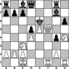 game notation in PGN-format [Event "Einstand"] [Site "www.myChess.de"] [Date "2010.12.10"] [Round "1"] [White "espero"] [Black "BobbyF4"] [ECO "A40"] [WhitemyELO "1632"] [BlackmyELO "1565"] [Result "1-0"] [TimeControl "10/864000"] [WhiteDays "10"] [BlackDays "08"] [MyChessNo "70469"] 1. d4 e6 2. e4 d6 3. f4 Nd7 4. Nf3 Ne7 5. Nc3 g6 6. h4 Bg7 7. h5 h6 8. hxg6 fxg6 9. Be3 Nf6 10. Bd3 Ng4 11. Qd2 Nc6 12. O-O-O Nb4 13. e5 Nxd3+ 14. Qxd3 Nxe3 15. Qxe3 d5 16. Qd3 Kf7 17. Nh4 g5 18. Ng6 Rg8 19. Rdf1 g4 20. Nh4 Ke7 21. f5 Kd7 22. fxe6+ Kxe6 23. Qf5+ 1-0 position notation in FEN-format r1bq2r1/ppp3b1/4k2p/3pPQ2/3P2pN/2N5/PPP3P1/2K2R1R - - - 1 23 Captured white pieces: Captured black pieces: Click on a captured piece in order to display the desired move!