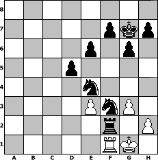 game notation in PGN-format [Event "Ende 2014"] [Site "www.myChess.de"] [Date "2014.12.20"] [Round "1"] [White "Achimkogge"] [Black "Tomino"] [ECO "D00"] [WhitemyELO "1462"] [BlackmyELO "1564"] [Result "0-1"] [TimeControl "10/2592000"] [WhiteDays "144"] [BlackDays "128"] [MyChessNo "97202"] 1. d4 d5 2. c3 Nf6 3. Bf4 e6 4. Nf3 c5 5. dxc5 Bxc5 6. b4 Bd6 7. e3 O-O 8. Ne5 Qc7 9. Bd3 Bxe5 10. Bxe5 Qxe5 11. Qf3 Nc6 12. a3 a6 13. O-O b5 14. Ra2 Bb7 15. Rc2 Qd6 16. Qd1 Ne5 17. Be2 Nc4 18. Bf3 a5 19. Ra2 axb4 20. cxb4 Ra4 21. Qb3 Rfa8 22. Rd1 Qe7 23. g3 Nd7 24. Rd4 Nb8 25. Bd1 Nc6 26. Rh4 Nxb4 27. Ra1 Qf6 28. Qc3 Qxc3 29. Nxc3 Rxa3 30. Rxa3 Rxa3 31. Nxb5 Ra1 32. Nc3 Rc1 33. Kf1 Rxc3 34. Ke2 Nc6 35. Ba4 Ne7 36. Rd4 Bc6 37. Bxc6 Nxc6 38. Rd1 Rc2+ 39. Kf3 Nd2+ 40. Kg2 Ne4 41. Ra1 Rxf2+ 42. Kg1 g6 43. Ra8+ Kg7 44. Ra1 Ne5 45. Rf1 Nf3+ 0-1 position notation in FEN-format 8/5pkp/4p1p1/3p4/4n3/4PnP1/5r1P/5RK1 - - - 6 46 Captured white pieces: Captured black pieces: Click on a captured piece in order to display the desired move!