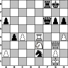 game notation in PGN-format [Event "Schach dem Osterhasen IV"] [Site "www.myChess.de"] [Date "2015.03.29"] [Round "1"] [White "Caligula"] [Black "faustballer"] [ECO "C34"] [WhitemyELO "1385"] [BlackmyELO "1498"] [Result "0-1"] [TimeControl "10/2592000"] [WhiteDays "101"] [BlackDays "090"] [MyChessNo "98737"] 1. e4 e5 2. f4 exf4 3. Nf3 g6 4. d4 Bg7 5. Bxf4 a6 6. Bc4 c6 7. Ng5 d5 8. exd5 cxd5 9. Bd3 Nc6 10. c3 Bh6 11. h4 Qe7+ 12. Be2 Nf6 13. O-O Bf5 14. Nd2 Ne4 15. Ngxe4 Bxf4 16. Rxf4 Bxe4 17. Qf1 f5 18. Re1 h6 19. Qf2 O-O 20. b3 b5 21. c4 dxc4 22. bxc4 b4 23. Bf3 Rae8 24. Qg3 Qg7 25. Bxe4 fxe4 26. Rfxe4 Rxe4 27. Rxe4 Nxd4 28. Nf1 Qf6 29. Ne3 Ne2+ 0-1 position notation in FEN-format 5rk1/8/p4qpp/8/1pP1R2P/4N1Q1/P3n1P1/6K1 - - - 4 30 Captured white pieces: Captured black pieces: Click on a captured piece in order to display the desired move!