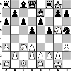 game notation in PGN-format [Event "Endspurt 2018"] [Site "www.myChess.de"] [Date "2018.11.09"] [Round "1"] [White "MiFie"] [Black "Seneca"] [ECO "B07"] [WhitemyELO "1123"] [BlackmyELO "1485"] [Result "0-1"] [TimeControl "10/864000"] [WhiteDays "08"] [BlackDays "10"] [MyChessNo "113408"] 1. e4 d6 2. Nf3 Nf6 3. Nc3 c6 4. Bc4 e6 5. O-O d5 6. Bd3 Be7 7. e5 Nfd7 8. a3 O-O 9. h3 a6 10. Nd4 Nxe5 11. Qh5 Nxd3 12. cxd3 Nd7 13. Nf3 f5 14. Re1 Nf6 15. Ng5 Nxh5 0-1 position notation in FEN-format r1bq1rk1/1p2b1pp/p1p1p3/3p1pNn/8/P1NP3P/1P1PPPP1/R1B1R1K1 - - - 0 16 Captured white pieces: Captured black pieces: Click on a captured piece in order to display the desired move!