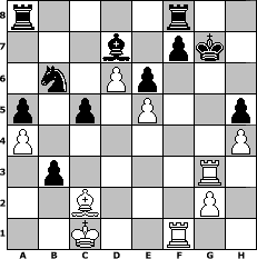 game notation in PGN-format [Event "3. Haithabu-Spiele"] [Site "www.myChess.de"] [Date "2009.07.01"] [Round "1"] [Board "4"] [White "freizeitspieler"] [Black "Naunhofer"] [ECO "B01"] [WhitemyELO "1560"] [BlackmyELO "1662"] [Result "1-0"] [TimeControl "10/2592000"] [WhiteDays "30"] [BlackDays "30"] [MyChessNo "57096"] 1. e4 d5 2. exd5 Nf6 3. Bc4 Nxd5 4. Qf3 e6 5. Ne2 Bc5 6. Nbc3 c6 7. d4 Bd6 8. Ne4 Be7 9. Qg3 g6 10. Bh6 Nd7 11. O-O-O N7f6 12. Qe5 Rg8 13. f3 Nxe4 14. fxe4 Bd6 15. Qg5 Qxg5+ 16. Bxg5 Nb6 17. Bb3 Be7 18. h4 Bd7 19. c4 h5 20. Bxe7 Kxe7 21. c5 Nc8 22. d5 b6 23. d6+ Kf6 24. Rhf1+ Kg7 25. e5 bxc5 26. Nf4 Nb6 27. Rf3 a5 28. a4 c4 29. Bc2 c5 30. Rdf1 Rgf8 31. b3 cxb3 32. Nxh5+ gxh5 33. Rg3+ 1-0 position notation in FEN-format r4r2/3b1pk1/1n1Pp3/p1p1P2p/P6P/1p4R1/2B3P1/2K2R2 - - - 1 33 Captured white pieces: Captured black pieces: Click on a captured piece in order to display the desired move!
