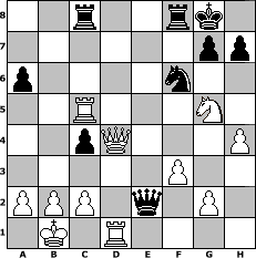 game notation in PGN-format [Event "?"] [Site "www.myChess.de"] [Date "2023.03.06"] [Round "?"] [White "Charli"] [Black "kalle"] [ECO "B90"] [WhitemyELO "1663"] [BlackmyELO "1560"] [Result "0-1"] [TimeControl "10/1728000"] [WhiteDays "20"] [BlackDays "20"] [MyChessNo "129541"] 1. e4 c5 2. Nf3 d6 3. d4 cxd4 4. Nxd4 Nf6 5. Nc3 a6 6. Be3 e5 7. Nb3 Be6 8. Qd2 Be7 9. f3 Nbd7 10. O-O-O b5 11. Kb1 Nb6 12. Qf2 Rb8 13. h4 Nc4 14. Ba7 Rc8 15. Bxc4 bxc4 16. Bb6 Qd7 17. Nc5 Qc6 18. Nxe6 fxe6 19. Rhe1 O-O 20. Be3 d5 21. exd5 exd5 22. Bg5 d4 23. Rxe5 Ng4 24. Qxd4 Bxg5 25. Rxg5 Nf6 26. Ne4 Qe6 27. Re5 Qc6 28. Rc5 Qe6 29. Ng5 Qe2 0-1 position notation in FEN-format 2r2rk1/6pp/p4n2/2R3N1/2pQ3P/5P2/PPP1q1P1/1K1R4 - - - 9 30 Captured white pieces: Captured black pieces: Click on a captured piece in order to display the desired move!