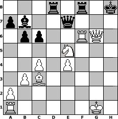 game notation in PGN-format [Event "Internetmeisterschaft Sfr. Heimersheim 2008"] [Site "www.myChess.de"] [Date "2008.03.05"] [Round "1"] [White "Press@"] [Black "stefan"] [ECO "A01"] [WhitemyELO "1500"] [BlackmyELO "1674"] [Result "1-0"] [TimeControl "10/2592000"] [WhiteDays "59"] [BlackDays "48"] [MyChessNo "43131"] 1. b3 Nf6 2. Bb2 e6 3. c4 d5 4. d3 Bb4+ 5. Nd2 O-O 6. Ngf3 b6 7. g3 Bb7 8. Bg2 c6 9. O-O Nbd7 10. e4 dxe4 11. dxe4 Bxd2 12. Nxd2 e5 13. Qe2 Qc7 14. f4 Rae8 15. f5 Rd8 16. g4 h6 17. h4 Nc5 18. g5 hxg5 19. hxg5 Nh7 20. f6 Nd3 21. fxg7 Kxg7 22. Bc3 Qe7 23. Nf3 Nf4 24. Qb2 f6 25. gxf6+ Nxf6 26. Nxe5 Nxg2 27. Qxg2+ Kh7 28. Qg6+ Kh8 29. Rxf6 1-0 position notation in FEN-format 3r1r1k/pb2q3/1pp2RQ1/4N3/2P1P3/1PB5/P7/R5K1 - - - 0 29 Captured white pieces: ![]() ![]() ![]() ![]() ![]() ![]() ![]() ![]() ![]() ![]() ![]() ![]() ![]() ![]() ![]() Captured black pieces: ![]() ![]() ![]() ![]() ![]() ![]() ![]() ![]() ![]() ![]() ![]() ![]() ![]() ![]() ![]() Click on a captured piece in order to display the desired move!