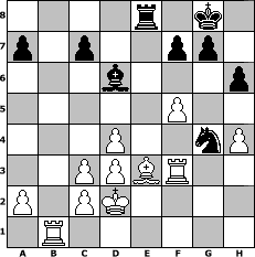 game notation in PGN-format [Event "Clubmeisterschaft der Godzillas 2016"] [Site "www.myChess.de"] [Date "2016.02.15"] [Round "1"] [White "JessicaN"] [Black "wolni55"] [ECO "A22"] [WhitemyELO "1560"] [BlackmyELO "1482"] [Result "0-1"] [TimeControl "10/2592000"] [WhiteDays "00"] [BlackDays "83"] [MyChessNo "102548"] 1. c4 e5 2. Nc3 Nf6 3. g3 d5 4. cxd5 Nxd5 5. Bg2 Nxc3 6. bxc3 Bf5 7. Bxb7 Nd7 8. Bxa8 Qxa8 9. Nf3 e4 10. g4 exf3 11. gxf5 Qe4 12. d4 Bd6 13. Qd3 Qxd3 14. exd3 O-O 15. Rb1 Re8+ 16. Be3 Nf6 17. Kd2 h6 18. h4 Ng4 19. Rh3 Nxf2 20. Rxf3 Ng4 0-1 position notation in FEN-format 4r1k1/p1p2pp1/3b3p/5P2/3P2nP/2PPBR2/P1PK4/1R6 - - - 1 21 Captured white pieces: Captured black pieces: Click on a captured piece in order to display the desired move!