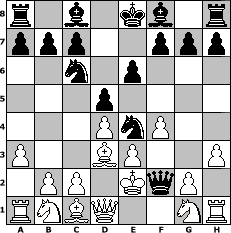 game notation in PGN-format [Event "unter uns Nr. 17"] [Site "www.myChess.de"] [Date "2014.02.13"] [Round "1"] [White "borsti"] [Black "Caligula"] [ECO "A03"] [WhitemyELO "1263"] [BlackmyELO "1474"] [Result "0-1"] [TimeControl "10/864000"] [WhiteDays "10"] [BlackDays "10"] [MyChessNo "92907"] 1. f4 d5 2. d4 Nf6 3. h3 e6 4. a3 Nc6 5. e3 Ne4 6. Bd3 Qh4+ 7. Ke2 Qf2# 0-1 position notation in FEN-format r1b1kb1r/ppp2ppp/2n1p3/3p4/3PnP2/P2BP2P/1PP1KqP1/RNBQ2NR - kq - 5 8 Captured white pieces: Captured black pieces: Click on a captured piece in order to display the desired move!