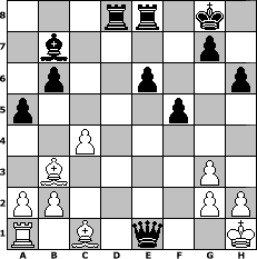 game notation in PGN-format [Event "Advents-Open 2011"] [Site "www.myChess.de"] [Date "2011.11.27"] [Round "1"] [White "Master1"] [Black "martinus"] [ECO "A45"] [WhitemyELO "1264"] [BlackmyELO "1765"] [Result "0-1"] [TimeControl "10/864000"] [WhiteDays "10"] [BlackDays "10"] [MyChessNo "77721"] 1. d4 Nf6 2. e3 d5 3. Bd3 e6 4. Nf3 Bd6 5. O-O O-O 6. Nbd2 b6 7. c3 c5 8. Qe2 c4 9. Bc2 Nc6 10. Ng5 h6 11. Ngf3 Re8 12. e4 dxe4 13. Nxe4 a5 14. Nxd6 Qxd6 15. Ne5 Bb7 16. Nxc4 Qc7 17. Ne5 Nxe5 18. dxe5 Nd5 19. Qd3 f5 20. Bb3 Rad8 21. c4 Nf4 22. Qg3 Ne2+ 23. Kh1 Nxg3+ 24. fxg3 Qxe5 25. Re1 Qxe1# 0-1 position notation in FEN-format 3rr1k1/1b4p1/1p2p2p/p4p2/2P5/1B4P1/PP4PP/R1B1q2K - - - 0 26 Captured white pieces: ![]() ![]() ![]() ![]() ![]() ![]() ![]() ![]() ![]() ![]() ![]() ![]() ![]() ![]() ![]() Captured black pieces: ![]() ![]() ![]() ![]() ![]() ![]() ![]() ![]() ![]() ![]() ![]() ![]() ![]() ![]() ![]() Click on a captured piece in order to display the desired move!
