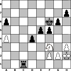 game notation in PGN-format [Event "Februar 2017"] [Site "www.myChess.de"] [Date "2017.02.05"] [Round "1"] [White "hape50"] [Black "Joschi"] [ECO "A45"] [WhitemyELO "1314"] [BlackmyELO "1577"] [Result "0-1"] [TimeControl "10/1728000"] [WhiteDays "47"] [BlackDays "80"] [MyChessNo "106804"] 1. d4 Nf6 2. e3 d5 3. h3 e6 4. Nf3 c5 5. c3 Nc6 6. Bb5 Bd7 7. Bxc6 Bxc6 8. Ne5 Bb5 9. a4 Bc6 10. Nxc6 bxc6 11. O-O Bd6 12. Na3 cxd4 13. exd4 c5 14. Nb5 Be7 15. Bf4 O-O 16. dxc5 Bxc5 17. Nc7 Rc8 18. Nb5 a6 19. Nd4 Re8 20. Nf3 Bd6 21. Bd2 Qb6 22. b4 Ne4 23. Qc2 Bxb4 24. Rab1 Qa5 25. Rxb4 Qxb4 26. Ra1 Nxd2 27. Qxd2 Qxc3 28. Qxc3 Rxc3 29. Ne5 f6 30. Nf3 e5 31. Nh4 d4 32. Nf5 g6 33. Nh6+ Kg7 34. Ng4 f5 35. Nh2 Rec8 36. Nf3 Rc1+ 37. Rxc1 Rxc1+ 38. Kh2 Kf6 0-1 position notation in FEN-format 8/7p/p4kp1/4pp2/P2p4/5N1P/5PPK/2r5 - - - 2 39 Captured white pieces: Captured black pieces: Click on a captured piece in order to display the desired move!