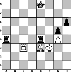 game notation in PGN-format [Event "Es wird bald Sommer"] [Site "www.myChess.de"] [Date "2015.05.12"] [Round "1"] [White "reisinger"] [Black "Andylein1989"] [ECO "D35"] [WhitemyELO "1534"] [BlackmyELO "1506"] [Result "0-1"] [TimeControl "10/2592000"] [WhiteDays "29"] [BlackDays "30"] [MyChessNo "99217"] 1. d4 d5 2. c4 e6 3. Nc3 Nf6 4. a3 Be7 5. Bf4 O-O 6. c5 b6 7. b4 Bb7 8. h3 Nbd7 9. cxb6 axb6 10. e3 c5 11. bxc5 bxc5 12. dxc5 Nxc5 13. Nf3 Nce4 14. Nxe4 Nxe4 15. Bd3 Nc5 16. O-O Nxd3 17. Qxd3 Bf6 18. Ra2 Qa5 19. Ne5 Ba6 20. Qc2 Bxf1 21. Kxf1 Bxe5 22. Bxe5 f6 23. Bd6 Rfc8 24. Qe2 Qc3 25. g3 Qc4 26. f4 Rc6 27. Bb4 Qxe2+ 28. Kxe2 Rc1 29. Bd2 Rc4 30. Kd3 h6 31. h4 Rca4 32. Bc1 e5 33. fxe5 fxe5 34. Ke2 Rc4 35. Bd2 Ra6 36. Kf2 Rg4 37. Kg2 Rag6 38. Be1 Rxh4 39. a4 Re4 40. Bf2 Ra6 41. a5 d4 42. exd4 exd4 43. Kf3 Re5 44. Bxd4 Rexa5 45. Re2 Kf7 46. Rc2 g5 47. g4 Ra4 48. Rc7+ Ke8 49. Be3 Re6 50. Rc3 Ree4 0-1 position notation in FEN-format 4k3/8/7p/6p1/r3r1P1/2R1BK2/8/8 - - - 7 51 Captured white pieces: Captured black pieces: Click on a captured piece in order to display the desired move!
