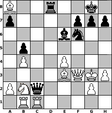 game notation in PGN-format [Event "K"] [Site "www.myChess.de"] [Date "2004.04.28"] [Round "1"] [White "rikilatic"] [Black "Knight"] [ECO "C24"] [WhitemyELO "1524"] [BlackmyELO "1478"] [Result "1-0"] [TimeControl "10/3456000"] [WhiteDays "120"] [BlackDays "120"] [MyChessNo "4203"] 1. e4 e5 2. Bc4 Nf6 3. d3 Bc5 4. Bg5 O-O 5. Qf3 d6 6. Nc3 Nbd7 7. h3 c6 8. Na4 Bd4 9. c3 Qa5 10. Qd1 Bb6 11. b4 Bxf2+ 12. Kxf2 Qc7 13. Nb2 Qd8 14. Qf3 b5 15. Bb3 d5 16. exd5 cxd5 17. Bxd5 Qb6+ 18. Be3 e4 19. dxe4 Qc7 20. Bxa8 Qxc3 21. Rb1 Ne5 22. Qe2 Rd8 23. Nf3 Nxf3 24. Qxf3 Qc2+ 25. Kg3 Be6 26. Rhc1 1-0 position notation in FEN-format B2r2k1/p4ppp/4bn2/1p6/1P2P3/4BQKP/PNq3P1/1RR5 - - - 4 26 Captured white pieces: ![]() ![]() ![]() ![]() ![]() ![]() ![]() ![]() ![]() ![]() ![]() ![]() ![]() ![]() ![]() Captured black pieces: ![]() ![]() ![]() ![]() ![]() ![]() ![]() ![]() ![]() ![]() ![]() ![]() ![]() ![]() ![]() Click on a captured piece in order to display the desired move!