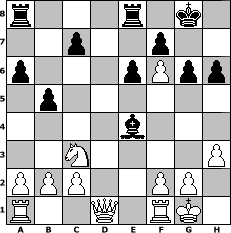 game notation in PGN-format [Event "Ja, is denn heut scho Weihnachten?"] [Site "www.myChess.de"] [Date "2014.12.06"] [Round "1"] [White "pepo47"] [Black "Mattheus"] [ECO "A15"] [WhitemyELO "2083"] [BlackmyELO "1295"] [Result "1-0"] [TimeControl "10/2592000"] [WhiteDays "57"] [BlackDays "55"] [MyChessNo "97071"] 1. c4 Nf6 2. d4 d5 3. Nf3 dxc4 4. e3 Nc6 5. Bxc4 g6 6. Nc3 Bg7 7. h3 e6 8. e4 O-O 9. O-O Re8 10. Bg5 a6 11. e5 h6 12. Bxf6 Bxf6 13. exf6 b5 14. Bd3 Qxf6 15. Be4 Bb7 16. Ne5 Nxe5 17. dxe5 Bxe4 18. exf6 1-0 position notation in FEN-format r3r1k1/2p2p2/p3pPpp/1p6/4b3/2N4P/PPP2PP1/R2Q1RK1 - - - 0 18 Captured white pieces: ![]() ![]() ![]() ![]() ![]() ![]() ![]() ![]() ![]() ![]() ![]() ![]() ![]() ![]() ![]() Captured black pieces: ![]() ![]() ![]() ![]() ![]() ![]() ![]() ![]() ![]() ![]() ![]() ![]() ![]() ![]() ![]() Click on a captured piece in order to display the desired move!
