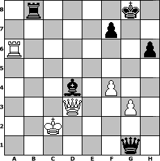 game notation in PGN-format [Event "Zwischendurch mal ein paar eigene Z"] [Site "www.myChess.de"] [Date "2009.06.25"] [Round "1"] [White "nogumo"] [Black "murphy12"] [ECO "A00"] [WhitemyELO "1717"] [BlackmyELO "1613"] [Result "0-1"] [TimeControl "10/1728000"] [WhiteDays "105"] [BlackDays "117"] [MyChessNo "56907"] 1. b4 c6 2. Bb2 a5 3. a3 Qb6 4. c4 axb4 5. c5 Qc7 6. axb4 Rxa1 7. Bxa1 b6 8. Nf3 bxc5 9. bxc5 Ba6 10. g3 Nf6 11. Bg2 d5 12. O-O e6 13. Be5 Qc8 14. d3 Nbd7 15. d4 Ne4 16. Nfd2 Nexc5 17. Bxg7 Bxg7 18. dxc5 Nxc5 19. Re1 O-O 20. e4 Nd3 21. Re3 d4 22. Rf3 Ne5 23. Ra3 c5 24. f4 Nc6 25. e5 Ne7 26. Ne4 Nf5 27. Nbd2 Bb7 28. Nc4 Bd5 29. Nb6 Qc6 30. Nxd5 exd5 31. Ng5 Ne3 32. Qb1 Qg6 33. Qb5 Nxg2 34. Kxg2 h6 35. Nf3 Qc2+ 36. Kh3 Qc4 37. Qc6 d3 38. Ra5 Qe4 39. Nd2 Qb4 40. Ra2 Qd4 41. Nf3 Qe4 42. Nd2 Qf5+ 43. Kg2 c4 44. Qxd5 c3 45. Ne4 c2 46. Qxd3 c1=Q 47. Nf6+ Qxf6 48. exf6 Qc6+ 49. Kf2 Bxf6 50. Ra6 Bd4+ 51. Kf1 Qh1+ 52. Ke2 Re8+ 53. Kd2 Qxh2+ 54. Kd1 Qg1+ 55. Kc2 Rb8 0-1 position notation in FEN-format 1r4k1/5p2/R6p/8/3b1P2/3Q2P1/2K5/6q1 - - - 4 56 Captured white pieces: Captured black pieces: Click on a captured piece in order to display the desired move!