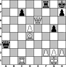 game notation in PGN-format [Event "Zwischendurch mal ein paar eigene Z"] [Site "www.myChess.de"] [Date "2007.11.12"] [Round "1"] [White "Naunhofer"] [Black "Knight"] [ECO "?"] [WhitemyELO "1660"] [BlackmyELO "1231"] [Result "1-0"] [TimeControl "10/1728000"] [WhiteDays "59"] [BlackDays "52"] [MyChessNo "39723"] 1. d4 Nf6 2. c4 e6 3. Nc3 d5 4. Nf3 Bb4 5. e3 Nc6 6. Qc2 Ne4 7. Nd2 Nxd2 8. Bxd2 O-O 9. a3 Ba5 10. b4 dxc4 11. bxa5 Nxa5 12. Rb1 f5 13. Qa4 Nc6 14. Bxc4 Bd7 15. Qc2 a6 16. O-O Kh8 17. Rxb7 Na5 18. Rb4 Nxc4 19. Rxc4 a5 20. Rc1 a4 21. Nxa4 Bxa4 22. Rxa4 Rxa4 23. Qxa4 g5 24. Qc4 f4 25. Qxe6 fxe3 26. Bxe3 Qa8 27. d5 Qxa3 28. Bd4+ 1-0 position notation in FEN-format 5r1k/2p4p/4Q3/3P2p1/3B4/q7/5PPP/2R3K1 - - - 1 28 Captured white pieces: Captured black pieces: Click on a captured piece in order to display the desired move!