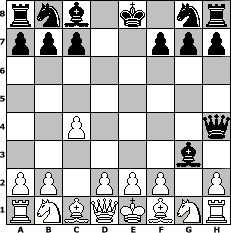 game notation in PGN-format [Event "unter uns Nr. 26"] [Site "www.myChess.de"] [Date "2015.02.14"] [Round "1"] [White "S04boy"] [Black "Mattheus"] [ECO "A02"] [WhitemyELO "1275"] [BlackmyELO "1206"] [Result "0-1"] [TimeControl "10/864000"] [WhiteDays "10"] [BlackDays "10"] [MyChessNo "98104"] 1. f4 e5 2. fxe5 d6 3. exd6 Bxd6 4. c4 Qh4+ 5. g3 Bxg3+ 0-1 position notation in FEN-format rnb1k1nr/ppp2ppp/8/8/2P4q/6b1/PP1PPP1P/RNBQKBNR - KQkq - 0 6 Captured white pieces: ![]() ![]() ![]() ![]() ![]() ![]() ![]() ![]() ![]() ![]() ![]() ![]() ![]() ![]() ![]() Captured black pieces: ![]() ![]() ![]() ![]() ![]() ![]() ![]() ![]() ![]() ![]() ![]() ![]() ![]() ![]() ![]() Click on a captured piece in order to display the desired move!