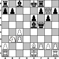 game notation in PGN-format [Event "Zur Fastenzeit"] [Site "www.myChess.de"] [Date "2018.03.15"] [Round "1"] [White "kalle"] [Black "sprinterde"] [ECO "A40"] [WhitemyELO "1624"] [BlackmyELO "1729"] [Result "0-1"] [TimeControl "10/3456000"] [WhiteDays "36"] [BlackDays "40"] [MyChessNo "111753"] 1. d4 e6 2. e4 Nf6 3. e5 Nd5 4. Nf3 c5 5. Nc3 Nxc3 6. bxc3 Qa5 7. Bd2 Nc6 8. c4 Qc7 9. c3 d6 10. Bf4 dxe5 11. Nxe5 Bd6 12. Qh5 g6 13. Qh6 cxd4 14. Nxc6 Bxf4 15. Qg7 Rf8 16. Nxd4 Qa5 17. Nb3 Qf5 18. Be2 Be5 0-1 position notation in FEN-format r1b1kr2/pp3pQp/4p1p1/4bq2/2P5/1NP5/P3BPPP/R3K2R - KQq - 5 19 Captured white pieces: ![]() ![]() ![]() ![]() ![]() ![]() ![]() ![]() ![]() ![]() ![]() ![]() ![]() ![]() ![]() Captured black pieces: ![]() ![]() ![]() ![]() ![]() ![]() ![]() ![]() ![]() ![]() ![]() ![]() ![]() ![]() ![]() Click on a captured piece in order to display the desired move!