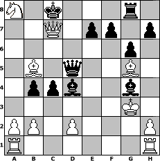 game notation in PGN-format [Event "Cafehausturnier f"] [Site "www.myChess.de"] [Date "2009.05.12"] [Round "1"] [White "SlowBrain"] [Black "rikilatic"] [ECO "A57"] [WhitemyELO "1424"] [BlackmyELO "1492"] [Result "1-0"] [TimeControl "10/864000"] [WhiteDays "10"] [BlackDays "10"] [MyChessNo "55649"] 1. d4 Nf6 2. c4 c5 3. d5 b5 4. cxb5 a6 5. Nc3 axb5 6. e4 b4 7. Nb5 d6 8. Bc4 Nxe4 9. Qe2 Bf5 10. Nf3 g6 11. g4 Nxf2 12. Kxf2 Bxg4 13. Bg5 Nd7 14. Qe4 Ne5 15. Nxe5 dxe5 16. Qxe5 Rg8 17. Nc7+ Kd7 18. Bb5+ Kc8 19. Nxa8 Bg7 20. Qf4 Bd4+ 21. Kg2 Qxd5+ 22. Kg3 c4 23. Qc7# 1-0 position notation in FEN-format N1k3r1/2Q1pp1p/6p1/1B1q2B1/1ppb2b1/6K1/PP1P3P/R6R - - - 1 23 Captured white pieces: Captured black pieces: Click on a captured piece in order to display the desired move!