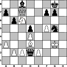 game notation in PGN-format [Event "Fr"] [Site "www.myChess.de"] [Date "2012.03.14"] [Round "1"] [White "ClaudiaN"] [Black "Lemmi11"] [ECO "C25"] [WhitemyELO "1843"] [BlackmyELO "1834"] [Result "1/2-1/2"] [TimeControl "10/2592000"] [WhiteDays "28"] [BlackDays "30"] [MyChessNo "80626"] 1. e4 e5 2. Nc3 Nc6 3. Bb5 Nf6 4. Nf3 Bc5 5. O-O O-O 6. Nxe5 Nxe5 7. d4 Bd6 8. f4 Neg4 9. e5 Bb4 10. f5 Re8 11. exf6 Nxf6 12. a3 Be7 13. Re1 c6 14. Bd3 Qb6 15. Be3 d5 16. Qf3 Bd6 17. h3 Bd7 18. Na4 Qc7 19. Nc5 Bg3 20. Bf2 Bxf2+ 21. Qxf2 h6 22. g4 b6 23. Na6 Qb7 24. Rxe8+ Rxe8 25. Re1 Qc8 26. Rxe8+ Qxe8 27. Qg3 h5 28. Nb8 hxg4 29. hxg4 Bc8 30. g5 Ne4 31. Qc7 Nxg5 32. Nxc6 Qe1+ 33. Kg2 Qd2+ 34. Kg3 Qe3+ 35. Kg2 Qf3+ 36. Kh2 Qf2+ 37. Kh1 Qe1+ 38. Kg2 Qd2+ 39. Kg3 1/2-1/2 position notation in FEN-format 2b3k1/p1Q2pp1/1pN5/3p1Pn1/3P4/P2B2K1/1PPqP3/8 - - - 14 39 Captured white pieces: ![]() ![]() ![]() ![]() ![]() ![]() ![]() ![]() ![]() ![]() ![]() ![]() ![]() ![]() ![]() Captured black pieces: ![]() ![]() ![]() ![]() ![]() ![]() ![]() ![]() ![]() ![]() ![]() ![]() ![]() ![]() ![]() Click on a captured piece in order to display the desired move!