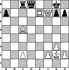 game notation in PGN-format [Event "Advents-Open 2011"] [Site "www.myChess.de"] [Date "2011.11.27"] [Round "1"] [White "martinus"] [Black "reisender"] [ECO "B00"] [WhitemyELO "1765"] [BlackmyELO "1451"] [Result "1-0"] [TimeControl "10/864000"] [WhiteDays "10"] [BlackDays "09"] [MyChessNo "77700"] 1. e4 b6 2. d4 Bb7 3. Nc3 d6 4. Bc4 e6 5. Nge2 d5 6. exd5 exd5 7. Bb3 Nf6 8. O-O Be7 9. Re1 O-O 10. Nf4 c5 11. Qf3 Na6 12. Ncxd5 Nxd5 13. Bxd5 Bxd5 14. Nxd5 Bd6 15. Be3 Re8 16. Rad1 Qb8 17. g3 Nc7 18. dxc5 bxc5 19. Qg4 Nxd5 20. Rxd5 Qxb2 21. Rxd6 Qc3 22. Re2 Qa1+ 23. Kg2 Qxa2 24. Bxc5 Rac8 25. Rc6 Qd5+ 26. Qf3 Qd7 27. Rxc8 Rxc8 28. Re7 Qd8 29. Qxf7+ 1-0 position notation in FEN-format 2rq2k1/p3RQpp/8/2B5/8/6P1/2P2PKP/8 - - - 0 29 Captured white pieces: ![]() ![]() ![]() ![]() ![]() ![]() ![]() ![]() ![]() ![]() ![]() ![]() ![]() ![]() ![]() Captured black pieces: ![]() ![]() ![]() ![]() ![]() ![]() ![]() ![]() ![]() ![]() ![]() ![]() ![]() ![]() ![]() Click on a captured piece in order to display the desired move!