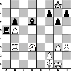 game notation in PGN-format [Event "4. Norderstedter DENK MAL Open 2013"] [Site "www.myChess.de"] [Date "2013.01.09"] [Round "1"] [White "Papale"] [Black "Teresa"] [ECO "A07"] [WhitemyELO "1609"] [BlackmyELO "1509"] [Result "1-0"] [TimeControl "10/2592000"] [WhiteDays "29"] [BlackDays "30"] [MyChessNo "86040"] 1. Nf3 d5 2. g3 Nf6 3. Bg2 c5 4. O-O Nc6 5. c4 d4 6. d3 e5 7. Nfd2 Bf5 8. a3 Bd6 9. Qc2 Qd7 10. Re1 Be7 11. Qa4 O-O 12. b4 Rfc8 13. b5 Nb4 14. axb4 cxb4 15. Qb3 Qc7 16. h3 Nd7 17. Nf1 a6 18. Bd2 axb5 19. Rxa8 Rxa8 20. cxb5 Nc5 21. Qb2 b3 22. Na3 Bxd3 23. Rc1 Bxe2 24. Bb4 Bxf1 25. Bxf1 g6 26. Bxc5 Bxc5 27. Nc4 d3 28. Qxe5 Qxe5 29. Nxe5 b6 30. Nxd3 Bd6 31. Rb1 Ra5 32. Rxb3 1-0 position notation in FEN-format 6k1/5p1p/1p1b2p1/rP6/8/1R1N2PP/5P2/5BK1 - - - 0 32 Captured white pieces: Captured black pieces: Click on a captured piece in order to display the desired move!