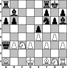 game notation in PGN-format [Event "Advent Advent"] [Site "www.myChess.de"] [Date "2021.12.14"] [Round "1"] [White "Hobbykegler"] [Black "kalle"] [ECO "A15"] [WhitemyELO "1083"] [BlackmyELO "1545"] [Result "0-1"] [TimeControl "10/2592000"] [WhiteDays "82"] [BlackDays "58"] [MyChessNo "123850"] 1. c4 Nf6 2. b3 g6 3. Bb2 Bg7 4. Qc2 O-O 5. Nc3 d5 6. cxd5 c5 7. dxc6 Nxc6 8. h3 Nb4 9. Qb1 b6 10. a3 Nc6 11. Nb5 e5 12. Qc2 Bb7 13. g4 a6 14. Nc3 Nd4 15. f3 Nxc2+ 16. Kd1 Nxa1 17. Bxa1 Bh6 18. d3 Qd6 19. e4 Qxa3 0-1 position notation in FEN-format r4rk1/1b3p1p/pp3npb/4p3/4P1P1/qPNP1P1P/8/B2K1BNR - - - 0 20 Captured white pieces: Captured black pieces: Click on a captured piece in order to display the desired move!