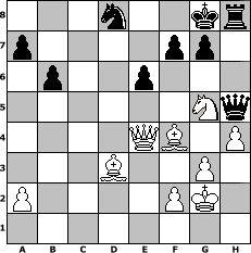 game notation in PGN-format [Event "Clubmeisterschaft der Godzillas 2016"] [Site "www.myChess.de"] [Date "2016.02.15"] [Round "1"] [White "woern63"] [Black "muetoe"] [ECO "B22"] [WhitemyELO "1994"] [BlackmyELO "1959"] [Result "1-0"] [TimeControl "10/2592000"] [WhiteDays "051"] [BlackDays "143"] [MyChessNo "102524"] 1. e4 c5 2. c3 e6 3. d3 d5 4. Nf3 Nc6 5. Qe2 Be7 6. e5 h5 7. Na3 Qb6 8. Nc2 d4 9. g3 Bd7 10. Bg2 dxc3 11. bxc3 Rd8 12. O-O Nb8 13. Ne3 Qc7 14. Nc4 Bc6 15. Bf4 h4 16. Rab1 b6 17. Nd6+ Kf8 18. Rfe1 Qd7 19. d4 h3 20. Bf1 cxd4 21. cxd4 Bd5 22. Rb5 Bb7 23. Nxb7 Qxb7 24. Rc1 Na6 25. d5 Nc7 26. Rxc7 Qxc7 27. d6 Qb7 28. dxe7+ Nxe7 29. Rb1 Nc6 30. Rd1 Rxd1 31. Qxd1 Qe7 32. Ng5 Qd8 33. Qa4 Qd7 34. Nxh3 Kg8 35. Ng5 Nxe5 36. Qe4 Nc6 37. Bb5 Qd1+ 38. Kg2 Nd8 39. Bd3 Qh5 40. h4 1-0 position notation in FEN-format 3n2kr/p4pp1/1p2p3/6Nq/4QB1P/3B2P1/P4PK1/8 - - - 0 40 Captured white pieces: Captured black pieces: Click on a captured piece in order to display the desired move!