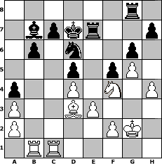 game notation in PGN-format [Event "Unser WM-Turnier"] [Site "www.myChess.de"] [Date "2018.07.07"] [Round "1"] [White "Helmut48"] [Black "HenrySchinasky"] [ECO "E18"] [WhitemyELO "2030"] [BlackmyELO "2146"] [Result "1/2-1/2"] [TimeControl "10/3456000"] [WhiteDays "40"] [BlackDays "40"] [MyChessNo "112535"] 1. d4 Nf6 2. c4 e6 3. Nf3 b6 4. g3 Bb7 5. Bg2 Be7 6. O-O O-O 7. Nc3 Ne4 8. Bd2 d5 9. cxd5 Nxc3 10. Bxc3 exd5 11. Ne5 Nd7 12. Nd3 Nf6 13. Rc1 Ne4 14. Bb4 Bxb4 15. Nxb4 a5 16. Nd3 Qd7 17. Qc2 Rac8 18. Rfd1 f6 19. e3 Kh8 20. Qb3 Bc6 21. Qc2 Bb7 22. Nf4 Rfe8 23. h4 f5 24. Qd3 Bc6 25. Bf1 Qd6 26. Qb3 Bb7 27. Rc2 Re7 28. Bg2 Kg8 29. Qa3 Qxa3 30. bxa3 g6 31. Rdc1 Kf8 32. Bf3 Ke8 33. g4 Kd7 34. Rb2 Ra8 35. g5 a4 36. Rb4 Ra5 37. Be2 Nd6 38. Kg2 Bc6 39. Rbb1 Bb7 40. Bd3 Ra8 41. Kh3 Rg8 42. Kg2 1/2-1/2 position notation in FEN-format 6r1/1bpkr2p/1p1n2p1/3p1pP1/p2P1N1P/P2BP3/P4PK1/1RR5 - - - 13 42 Captured white pieces: Captured black pieces: Click on a captured piece in order to display the desired move!