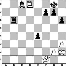 game notation in PGN-format [Event "> 1500"] [Site "www.myChess.de"] [Date "2010.03.18"] [Round "1"] [White "hape50"] [Black "Whiskey40"] [ECO "D00"] [WhitemyELO "1238"] [BlackmyELO "1445"] [Result "1-0"] [TimeControl "10/2592000"] [WhiteDays "120"] [BlackDays "105"] [MyChessNo "64110"] 1. d4 d5 2. h3 e6 3. Nf3 Qf6 4. e3 Bd6 5. Bd3 Ne7 6. a3 h6 7. Nc3 a6 8. e4 dxe4 9. Nxe4 Qxf3 10. Qxf3 Nbc6 11. Be3 e5 12. d5 Nxd5 13. Nxd6+ cxd6 14. O-O Nxe3 15. fxe3 O-O 16. Rad1 Be6 17. Be4 Rad8 18. Bxc6 bxc6 19. Qxc6 d5 20. Qxa6 e4 21. Rf2 Rc8 22. Qe2 Rc6 23. b4 Rfc8 24. Rd2 Rc3 25. a4 R3c4 26. b5 Rxa4 27. c3 Rxc3 28. b6 Bc8 29. Qb5 Ra1+ 30. Kh2 Rxe3 31. Rf1 Rxf1 32. Qxf1 Rb3 33. Rxd5 Rxb6 34. Rd8+ 1-0 position notation in FEN-format 2bR2k1/5pp1/1r5p/8/4p3/7P/6PK/5Q2 - - - 1 34 Captured white pieces: Captured black pieces: Click on a captured piece in order to display the desired move!