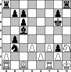 game notation in PGN-format [Event "Winter 2011/12"] [Site "www.myChess.de"] [Date "2011.12.22"] [Round "2"] [White "Grubengeist"] [Black "Erich"] [ECO "C68"] [WhitemyELO "1843"] [BlackmyELO "2016"] [Result "0-1"] [TimeControl "10/2592000"] [WhiteDays "66"] [BlackDays "90"] [MyChessNo "78426"] 1. e4 e5 2. Nf3 Nc6 3. Bb5 a6 4. Bxc6 dxc6 5. O-O Bg4 6. h3 h5 7. d3 Qf6 8. Nbd2 Bc5 9. Qe1 Ne7 10. d4 exd4 11. e5 Qe6 12. Ng5 Qg6 13. Nde4 Bb6 14. hxg4 hxg4 15. f3 g3 16. Nh3 Nf5 17. b4 d3+ 18. Nc5 a5 19. e6 Nd4 20. cxd3 axb4 21. Qe4 Bxc5 22. exf7+ Kxf7 23. Qxg6+ Kxg6 24. Kh1 Nb3 0-1 position notation in FEN-format r6r/1pp3p1/2p3k1/2b5/1p6/1n1P1PpN/P3P1P1/R1B2R1K - - - 2 25 Captured white pieces: Captured black pieces: Click on a captured piece in order to display the desired move!