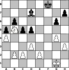 | game notation in PGN-format [Event "Schach f"] [Site "www.myChess.de"] [Date "2008.11.01"] [Round "1"] [Board "2"] [White "Andylein1989"] [Black "Seneca"] [ECO "C00"] [WhitemyELO "1745"] [BlackmyELO "1457"] [Result "1/2-1/2"] [TimeControl "10/2592000"] [WhiteDays "30"] [BlackDays "26"] [MyChessNo "49350"] 1. e4 e6 2. Nf3 Nf6 3. Nc3 g6 4. Bc4 Bg7 5. d3 Nc6 6. Bg5 e5 7. h3 O-O 8. O-O d6 9. Nd5 Na5 10. Nxf6+ Bxf6 11. Bxf6 Qxf6 12. Nd2 Nxc4 13. Nxc4 a5 14. a4 Qg5 15. Qf3 f5 16. exf5 Bxf5 17. Qe3 Qf6 18. Qh6 b6 19. f4 exf4 20. Rxf4 Qe7 21. Raf1 d5 22. Na3 Rae8 23. Nb5 c5 24. g4 Bd7 25. Rxf8+ Rxf8 26. Rxf8+ Qxf8 27. Qxf8+ Kxf8 1/2-1/2 position notation in FEN-format 5k2/3b3p/1p4p1/pNpp4/P5P1/3P3P/1PP1P3/6K1 - - - 0 28 Captured white pieces:                              Captured black pieces:                               Click on a captured piece in order to display the desired move!
