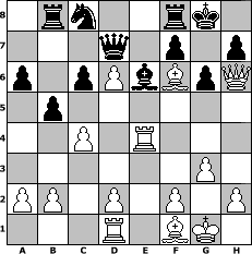 | game notation in PGN-format [Event "Winterturnier"] [Site "www.myChess.de"] [Date "2009.11.12"] [Round "1"] [White "reymund"] [Black "Rickado"] [ECO "A40"] [WhitemyELO "1624"] [BlackmyELO "1488"] [Result "1-0"] [TimeControl "10/3456000"] [WhiteDays "110"] [BlackDays "118"] [MyChessNo "60558"] 1. d4 e6 2. c4 d6 3. Nc3 Ne7 4. Nf3 Bd7 5. g3 g6 6. Bh3 Na6 7. O-O Bg7 8. e4 O-O 9. Bg2 c6 10. Bf4 Be8 11. Qb3 b6 12. Qa3 e5 13. Be3 exd4 14. Nxd4 Bxd4 15. Bxd4 Nc5 16. Bf6 Qc7 17. Rfe1 Nc8 18. e5 Bd7 19. Rad1 Be6 20. exd6 Qd7 21. Ne4 Nxe4 22. Rxe4 Rb8 23. Bf1 b5 24. Qe3 a6 25. Qh6 1-0 position notation in FEN-format 1rn2rk1/3q1p1p/p1pPbBpQ/1p6/2P1R3/6P1/PP1P1P1P/3R1BK1 - - - 1 25 Captured white pieces:                              Captured black pieces:                               Click on a captured piece in order to display the desired move!