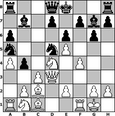 game notation in PGN-format [Event "Fernschachmeisterschaft Sfr. Heimersheim 2005"] [Site "www.myChess.de"] [Date "2005.08.06"] [Round "1"] [White "Charles@"] [Black "paula"] [ECO "B21"] [WhitemyELO "1500"] [BlackmyELO "1722"] [Result "0-1"] [TimeControl "10/2592000"] [WhiteDays "31"] [BlackDays "55"] [MyChessNo "15929"] 1. e4 c5 2. f4 g6 3. Nf3 Bg7 4. c3 Nc6 5. Bc4 Na5 6. Bb5 a6 7. Ba4 b5 8. Bc2 c4 9. d4 cxd3 10. Qxd3 Bb7 11. O-O Nf6 12. e5 Nd5 13. Nd4 e6 14. a4 b4 0-1 position notation in FEN-format r2qk2r/1b1p1pbp/p3p1p1/n2nP3/Pp1N1P2/2PQ4/1PB1P1PP/RNB2RK1 - kq - 0 15 Captured white pieces: ![]() ![]() ![]() ![]() ![]() ![]() ![]() ![]() ![]() ![]() ![]() ![]() ![]() ![]() ![]() Captured black pieces: ![]() ![]() ![]() ![]() ![]() ![]() ![]() ![]() ![]() ![]() ![]() ![]() ![]() ![]() ![]() Click on a captured piece in order to display the desired move!